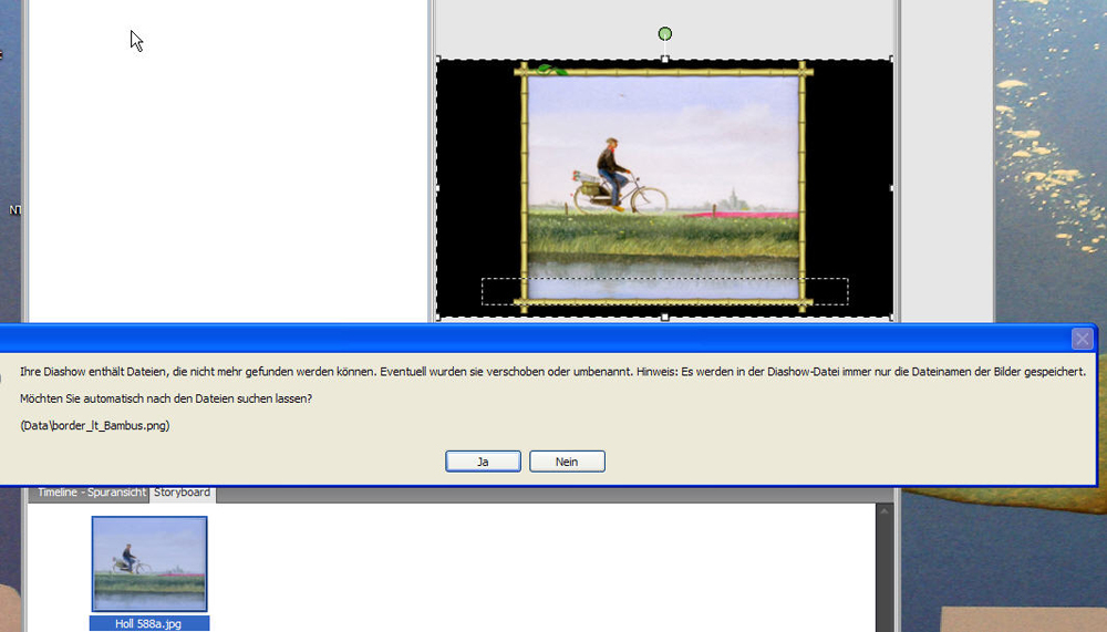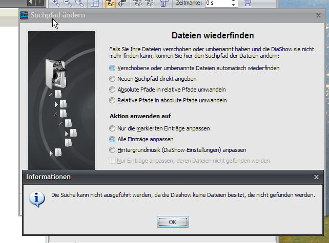 Beim Aufruf der abgespeicherten Schau erscheint sofort eine Fehlermeldung. Lasse ich nach den Dateien suchen, erklärt das System, es würden keine Dateien fehlen.
