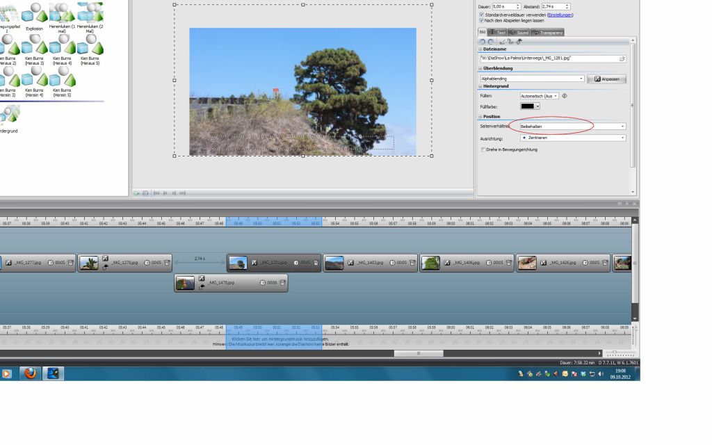 meine Diashow ist in 16:9 angelegt. Ich importiere mein Fotos im 3:2 Format, jedoch mit einer Größe von 2500 Pixeln an der langen Seite, damit ich noch etwas "Luft" habe. Ich ziehe dann eben dan Rahmen an jedem Bild so groß, bis es die 16:9 Fläche ausfüllt, da ich das Zuschneiden nicht der Automatik überlassen möchte. Das geht auch ganz gut. Bis eben die Kamerafahrt ins Spiel kommt. Ich möchte z.B. von einem 200*200 Pixel großen Bereich auf das volle Bild zoomen. Was passiert:Das volle Bild läßt sich nicht auf 16:9 anzeigen, sobald ich den Kameraschwenkmodus aktiviere, scheint der 16:9 Modus verschwunden. Auch ALLE anderen Bilder werden dann in 4:3 angezeigt, was man beim Abspielen ja gut sieht. Erst wenn ich DS 7 schließe und wieder öffne, werden die anderen Bilder wieder in 16:9 angezeigt. Versuche ich erneut eine Kamerafahrt, der gleiche Mist.... :twisted: