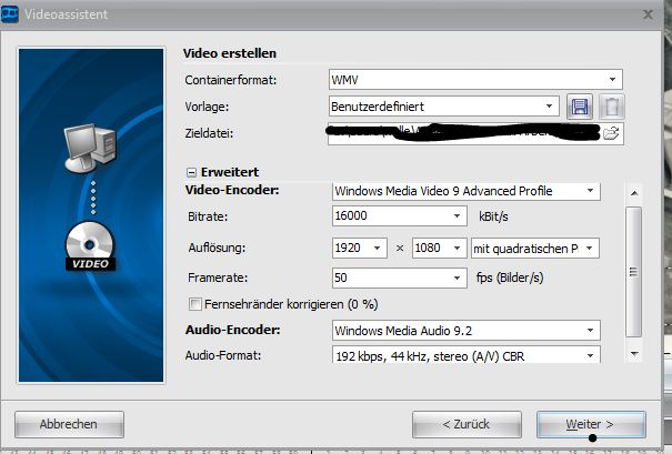 Eine Bitrate von 7000 kbit/s ist für ein Full HD Video zu niedrig. Ich erstelle meine Videos im WMV Format. Mit den Parametern, die Du im Sreen siehst.