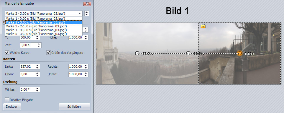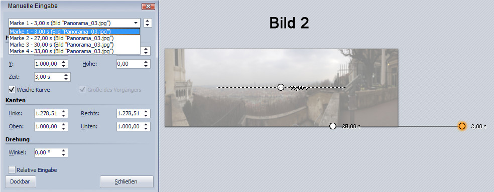 Du brauchst gar keine BW Marke löschen, wenn Du nach dem anklicken " Kameraschwenk festlegen" im Layoutdesigner bei der "Zeitmarke" gleich die 3 sec setzt und dann erst auf "neue BW Marke". Dann hat die zweite BW Marke 5 sec, die Du wie gewohnt anpasst.