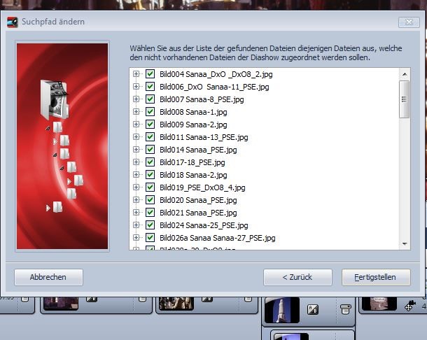 Jetzt habe ich einmal die Suche laufen lassen, obwohl mir keine Dateien abgehen und die Show einwandfrei läuft: siehe da - bei mir findet der Assistent fehlende Dateien, und zwar die Hälfte meiner Bilder und die Musikdatei! Es wird also doch mehr als ein Bild angezeigt (nach Laune )
