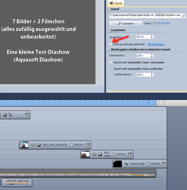Ja, das ist mein Screenshot. Nachdem ich auf den Hinweis von Werni das Häkchen bei "Hintergrundmusik zum Ende der Diashow ausblenden" entfernt hatte (ich arbeitete bei dieser Show mit HGM), war das kurze Aufblenden der Musik nach dem Ende der Show weg.