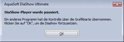 ich hab mein Notebook per HDMI an meien TV-Gerät angeschlossen, den Modus auf einzel Bildschirm TV/Beamer umgestellt. So weit so gut, Anzeige Desktop bzw. Aquasoft-Oberfläche wird dargestellt. Beim Starten der Show im Vollbildmodus wir die Anzeige hellgrau, die Musik läuft und diese Fehlermeldung erscheint: "Diashow-Player wurde pausiert...."