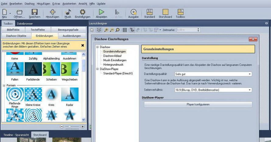 Da das keine Programmeinstellung ist, sondern eine Einstellung der einzelnen Diashow, findest Du die Einstellung unter 'Diashow - Einstellungen' und dann unter 'Überblendungen'.