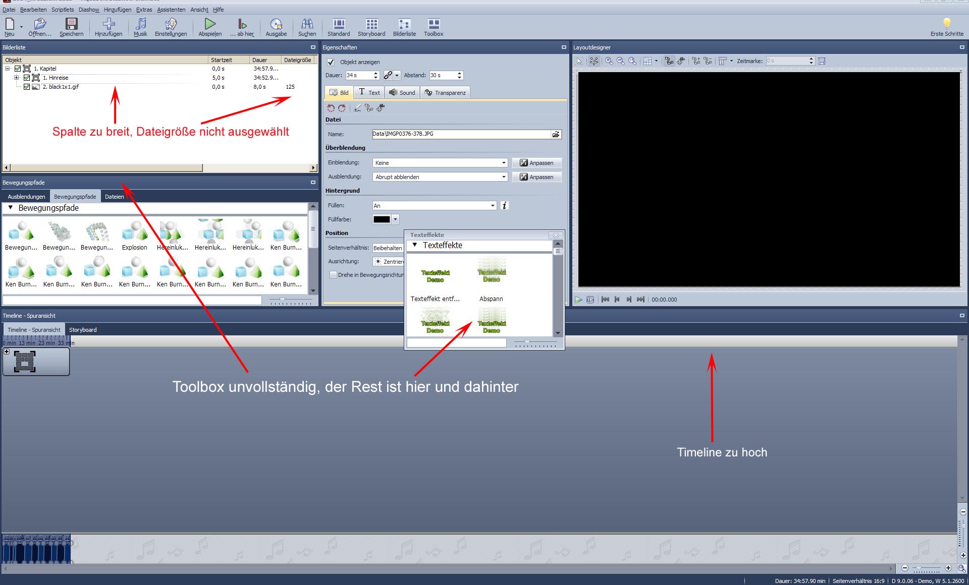 Lade ich meine alte Ansicht, nachdem ich das Diashow-Programm als Admin-User gestartet habe, wird wenigstens die Toolbox vollständig und korrekt angezeigt, der Rest passt ebenfalls nicht.