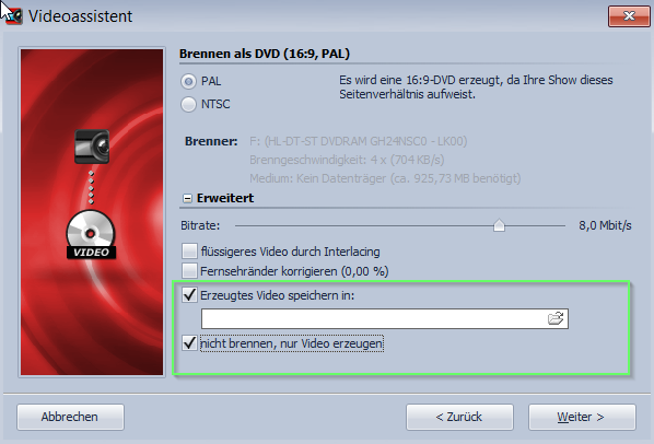 .wmv oder .avi erzeugen und dann mit dem externen Brenner