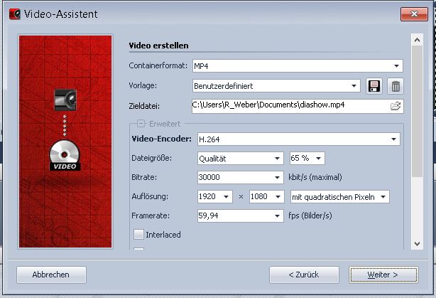 was heißt das nun genau? Ich benutze ja Video Assistenten. Da ich die Auflösung in wohl fast jedem Containerformat vorgeben kann, würde ich MP4 wählen. Alle anderen Einstellungen so lassen? Mal ehrlich, wie viele DiaShow-Anwender kennen sich mit den ganzen Einstellmöglichkeiten aus. Keine Ahnung wie sich eine Änderung einer Komponente auswirkt. Oder gibt es diesbezüglich noch eine einfachere Ausgabemöglichkeit? Ohne Bitrate und so?