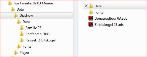 Und siehe, in dem Zielverzeichnis entsteht die Verzeichnisstruktur Zielverzeichnis / Diashow / Data (darin liegt dann die ads-Datei des Exports) / alle Ordner, die im Quellverzeichnis Daten für die Show enthielten also die Ordner Bilder und Musik.