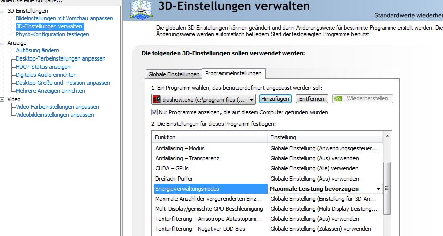 Jetzt hab ich wie von Dir beschrieben bei meiner Ati Radeon die DiaShow.exe zugefügt und jetzt ist fast alles perfekt. Die Show wird fast so flüssig abgespielt wie das Video, das ich später daraus anfertige.
