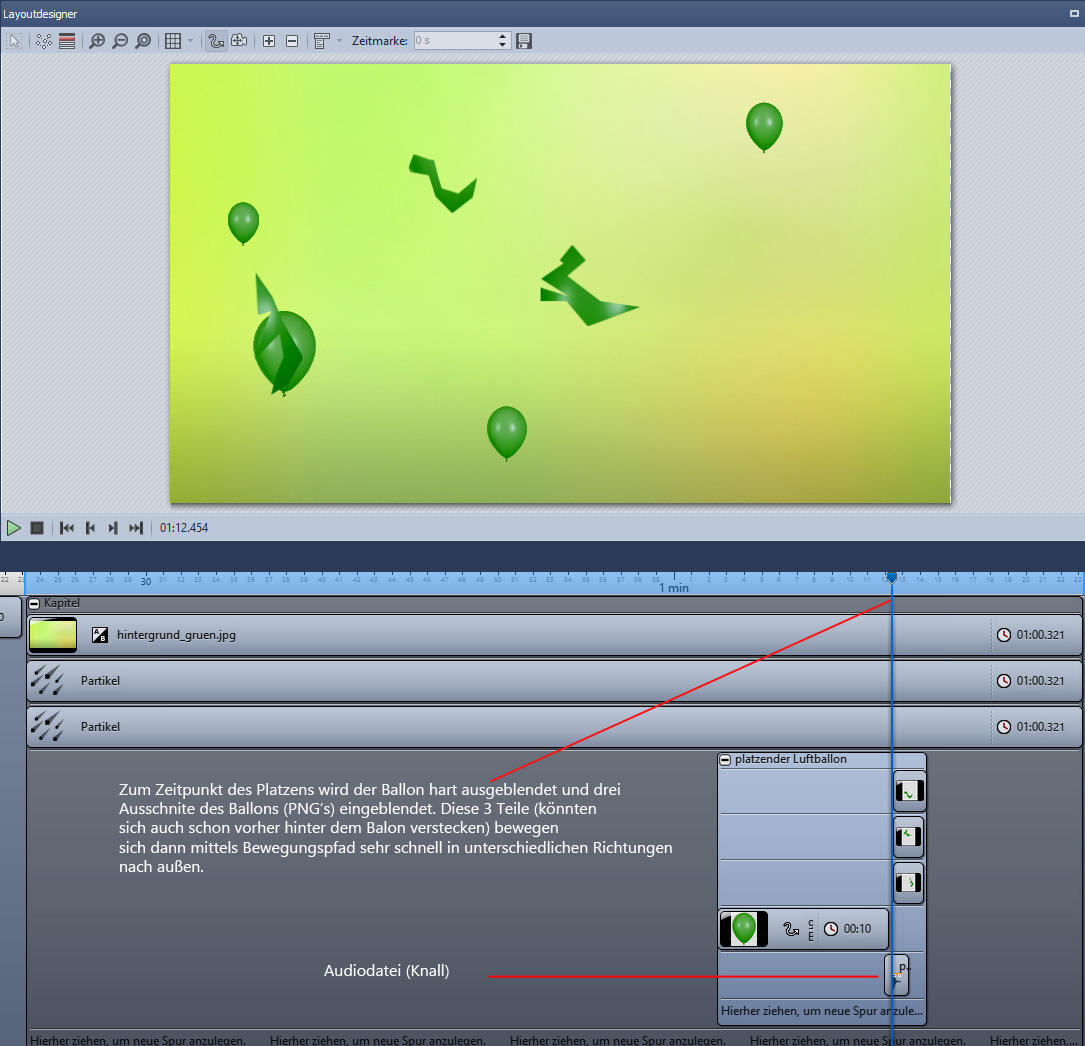 Bei einer fertigzustellenden Diashow sollten viele grüne Luftballons durchs Bild fliegen. Das ließ sich natürlich einfach mit dem Partkelwerkzeug bewerkstelligen. Dann wurde ich aber gefragt, ob nicht ein Ballon platzen könnte. Das habe ich erst einmal verneint. In der Nacht viel mir dann aber die hier beschriebene Lösung ein. Diese läuft dann natürlich außerhalb des Partikelobjekts.