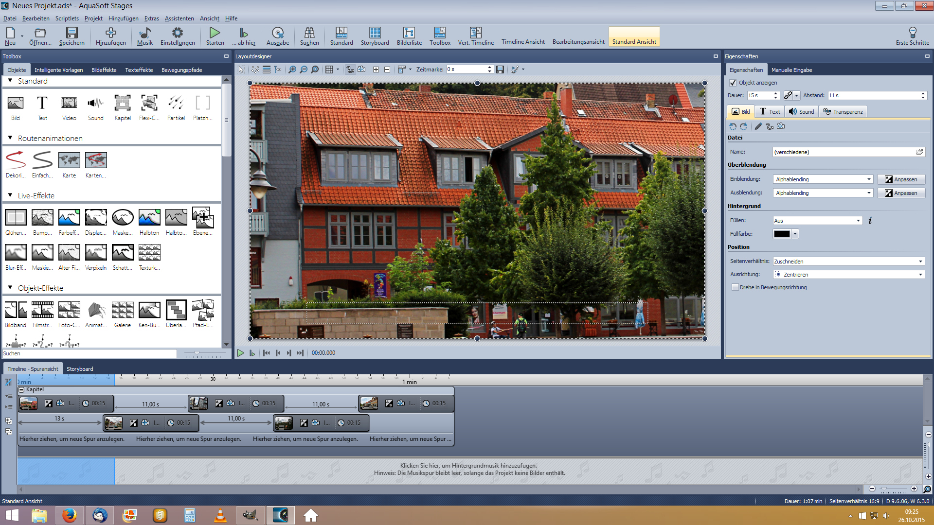 Diesen Effekt findest Du in der Toolbox als Objekt-Effekt. Den ziehst Du in die Timeline und füllst ihn mit den Bildern Deiner Wahl. Den Bewegungsablauf kannst Du vorher festlegen, Du kannst auch verschiedene Ken-Burnseffekte hintereinander legen und nicht vergessen: Füllen=AUS und Alphablending etwas länger stellen und Du wirst sehen, wie weich Deine Bilderfahrten verlaufen.