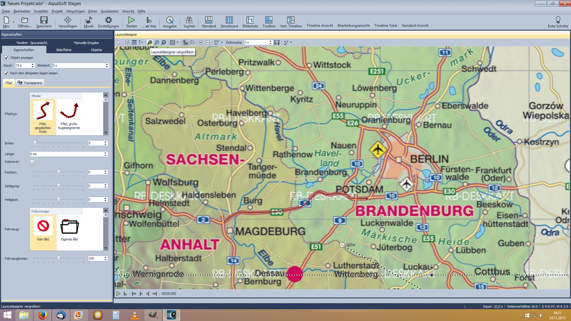 um die Pfadpunkte genau zu setzen habe ich mir eine neue Arbeitsansicht mit einem großen Layoutdesigner erstellt (Screenshot) Du kannst aber auch in der Standard-Fläche, mit dem Doppelpfeil, den Layoutdesigner vergrößern mit dem Pluszeichen kannst Du noch mehr ranzoomen, die Breite des Pfades mußt du verkleinern, ich nehme immer 5