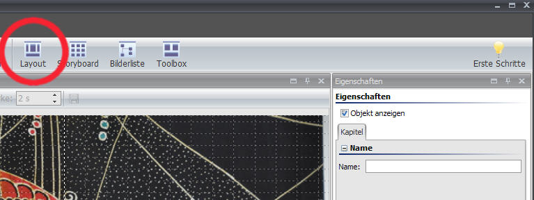 In der üblichen Layoutansicht (Button Layout) wird unten die Timeline angezeigt, links oben die diversen Objekte, Texteffekte u.s.w., in der Mitte das Fenster Layoutdesigner und rechts die Eigenschaften. Sofern in der Timeline ein Objekt (Bild u.s.w.) angeklickt (markiert) ist, füllt sich das Eigenschaftenfenster mit den diashowrelevanten Objekteigenschaften des markierten Objekts. Hat nichts mit dem Windows-rechte-Maus-Taste-Eigenschaften zu tun... ;-)