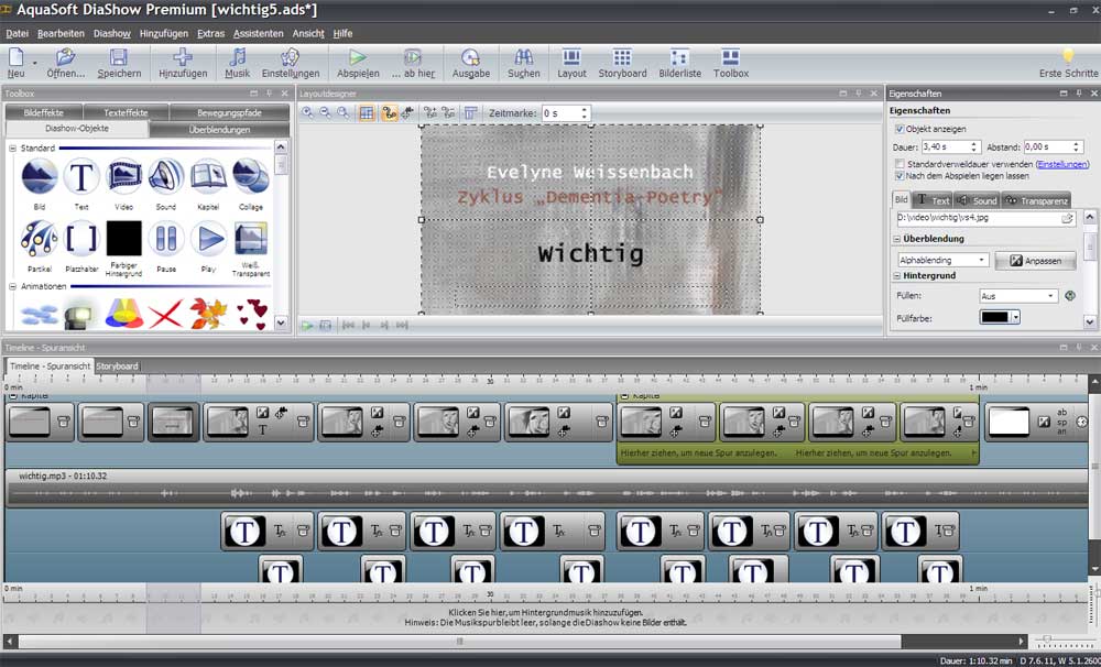 Vielleicht mal einen aussagekräftigen Screenshot vom Diashowprogramm mit Timeline, Eigenschaftsfenster und Layoutfenster hochladen.