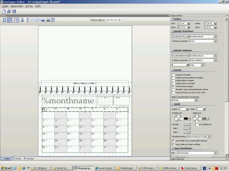 habe ein Probleme mit dem Photokalender (zieht sich durch verschiedene Vers. bis zur Vers. 3.6.05). Ich möchte in der Monatsseite eines Jahreskalenders die Wochen immer mit dem Montag beginnen lassen. Benutze dazu z.B. die Vorlage A3-Aufgeklappt. In der Seitendarstellung im Vorlageneditor wird mir alles korrekt angezeigt. Wenn ich jedoch in die Vorschau wechsel bzw. den Kalender drucke, beginnen die Wochen auf den einezelnen Monatsblättern mit ganz unterschiedlichen Tagen.