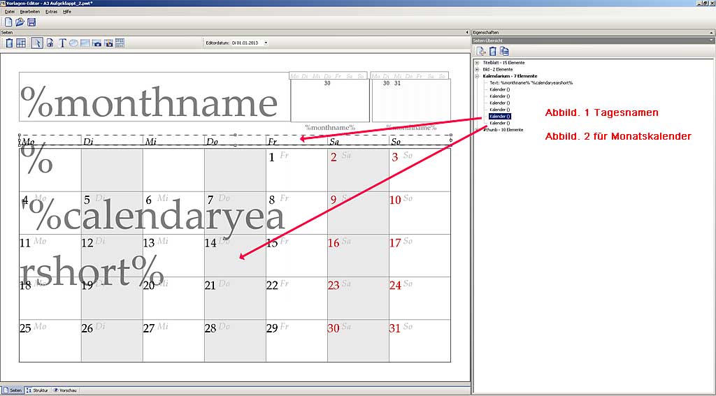 Wenn man im Vorlageneditor über die Seitenübersicht anstatt in die Untergruppe Kalendarium Kalender(), in die Untergruppe #thumb Kalender() gerät und dort die entsprechenden Einstellungen vornimt, wirken die Änderungen zwar in der Editordarstellung, aber nicht in der Vorschau bzw. im Ausdruck.