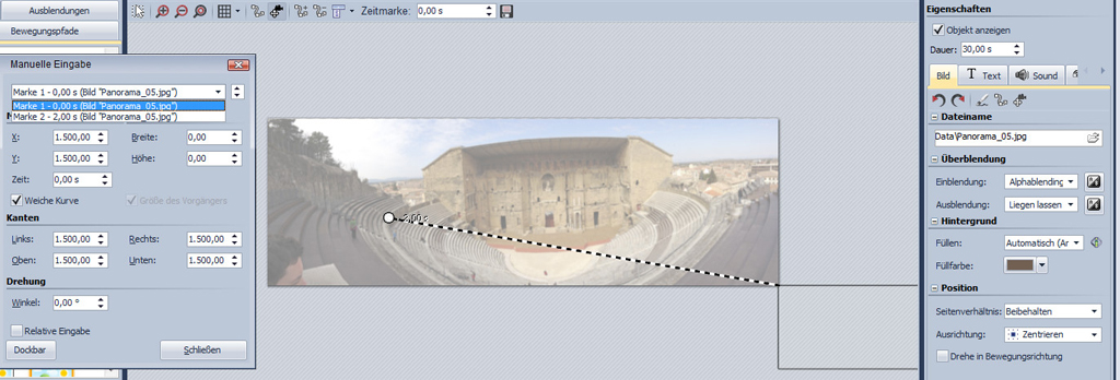 Ich arbeite z.Zt. an einer rel. großen DS mit ca. 160 Bilder, wovon 25 Panoramabilder enthalten sind. Bei einem Panoramabild (Pano_005.jpg) wollte ich, wie bei den vorherigen Panoramabilder auch, per Kameraschwenkfunktion einen Teilausschnitt langsam über das Bild wandern lassen. Dazu muss man einen Rahmen am Anfang und einen am Ende im Bild aufziehen, der die Stelle und Größe bestimmt, von wo nach wo der Ausschnitt über das Bild laufen soll. Anhand des unten beigefügten Bildschirmfotos können Sie nun sehen, dass es mir plötzlich, aus völlig unerfindlichem Gründen, nicht mehr möglich ist, einen Rahmen im Bild aufzuziehen, der den Anfang der Kamerafahrt festlegen soll. Ich kann nun tun und lassen was ich will, es geht partout nicht !!! (Deshalb entscheide ich mich leider notgedrungener Weise für die zweite Lösung, es zu lassen!)