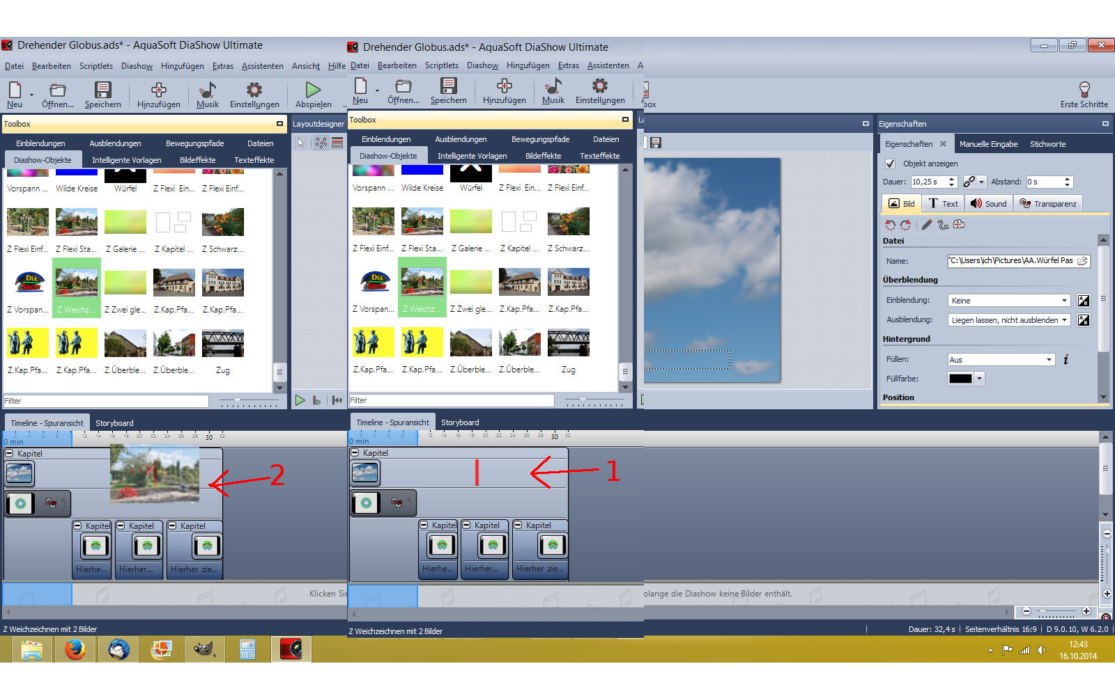 Wenn man die Bilder von der Bridge oder einem anderen Browser direkt in die DS9 zieht, sieht man in der Timeline durch das angedeutete Vorschaubild sehr schlecht den Einfügepunkt (roter Strich). Insbesondere wenn man Bilder auf diese Weise in die Flexi-Collage ziehen will, dessen Objekt ja bereits rot eingefärbt ist, fällt der rote Einfügestrich nicht auf bzw. er ist kaum sichtbar. Dies erschwert das Einfügen der Bilder über einen Browser. Vielleicht könnte man hier eine bessere Lösung finden.