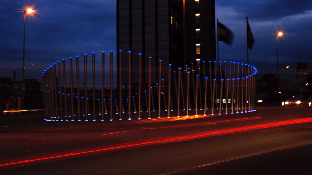 Lichtmalerei mit fahrenden Autos um einen Verkehrskreisel