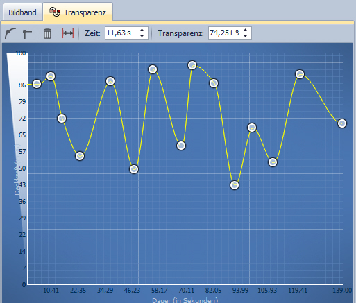 Das Bildband in der unteren Spur wechselt ständig die Transparenz zwischen 5 und 60 %, so dass das dahinter liegende Bildband und das HG-Bild immer wieder mehr oder weniger sichtbar werden.