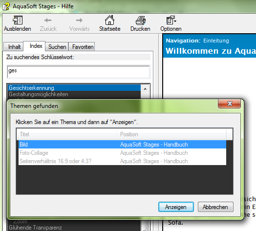 Dort reicht im Index die Eingabe von "ges" um bei der "Gesichtserkennung" zu landen, die dann ebenfalls 3 Treffer anzeigt.