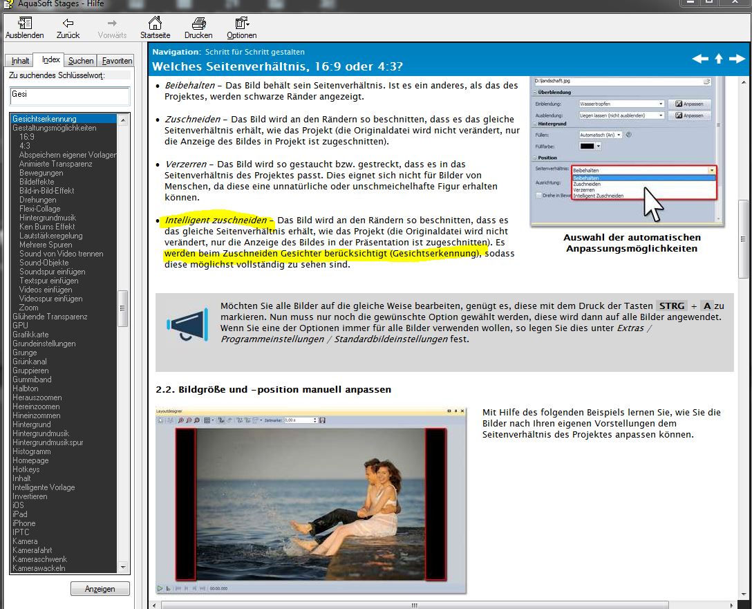 ingenius hat geschrieben:Jedoch werden in der Online-Hilfe unter dem Reiter Index drei Treffer angezeigt. Der erste Bild trifft sehr daneben. Der zweite Foto-Collage gibt zumindest einen minimalen Hinweis in Bezug auf das Zuschneiden von Bildern. Der dritte Seitenverhältnis 16:9 oder 4:3? gibt ebenfalls einen minimalen Hinweis auf das Zuschneiden von Bildern, wenn die Option Intelligentes Zuschneiden ausgewählt ist.