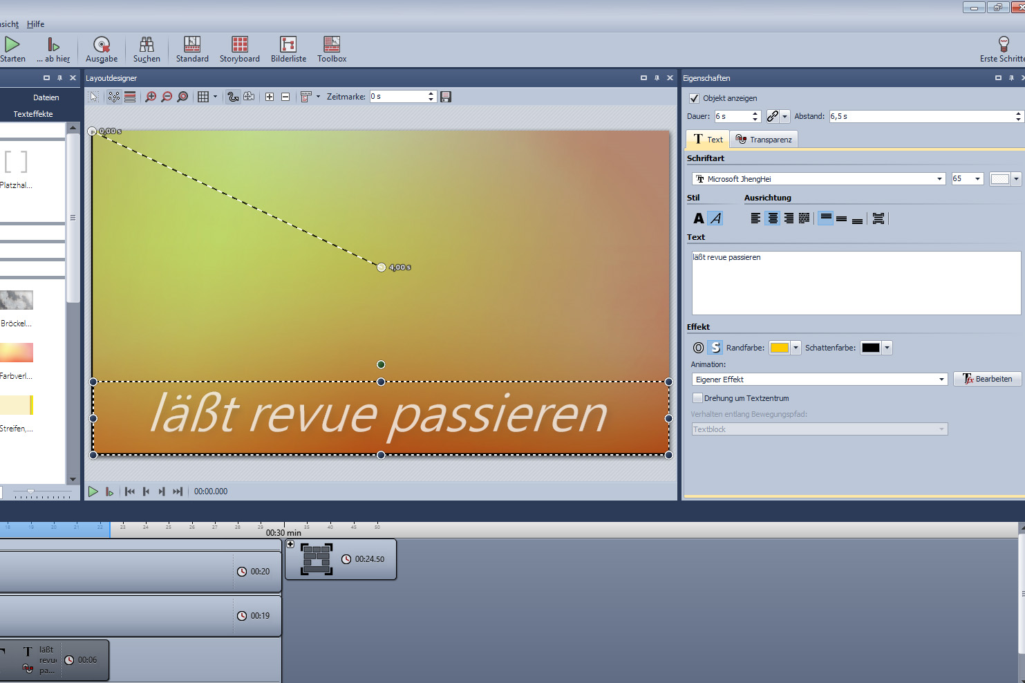 Die Schrift wird in der Diashow 9 in der Auswahl angezeigt und ist, soweit ich es beurteilen kann, auch eingeblendet. Ich habe Bildschirmausdrucke als jpg-Bilder angehängt. Vielleicht können Sie daran erkennen ob ich etwas falsch gemacht habe.