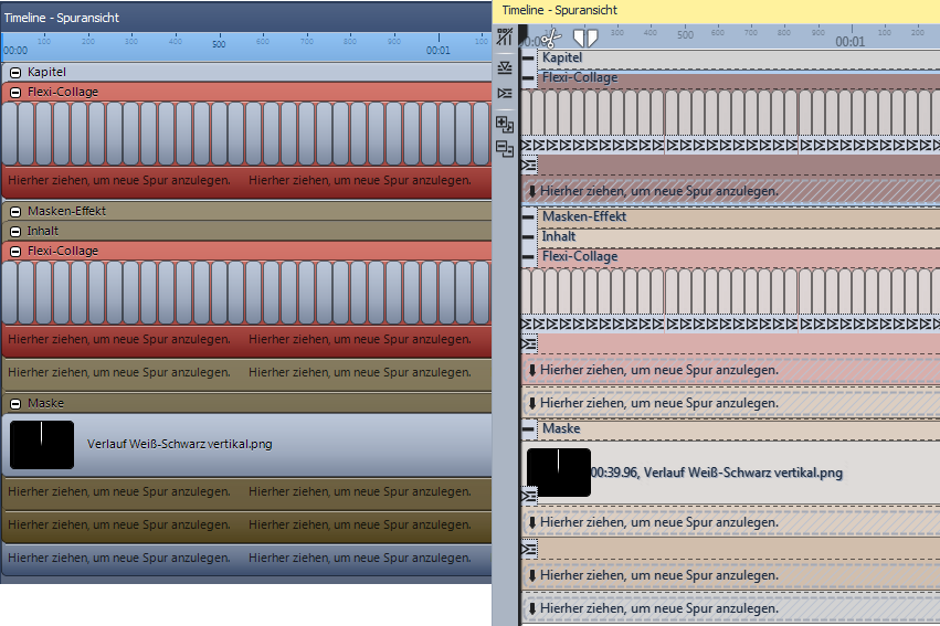 2. Die Timeline in DS8 wirkt insgesamt übersichtlicher. Vielleicht liegt es am Farbschema oder an den zusätzlichen Knöpfen oder den Schrägstrichen und Strichlinien ... ich weiß es nicht genau. Aber ich spüre halt den subjektiven Gesamteindruck. Die Timeline der DS8 hat weniger "visual clutter".