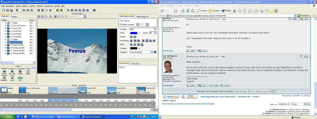 Danach fügtst Du dieses Bild an der/den stelle/stellen ein, an welchen Du Text haben willst. Die Darstellungszeit kannst Du auf z.B. 2 Sekunden stellen. Danach fügst Du nach dem "leeren" Bild das Textobjekt ein, in welchem Du Deinen Text schreiben kannst. Die Darstellungszeit stellst Du auf z.B 8 Sekunden