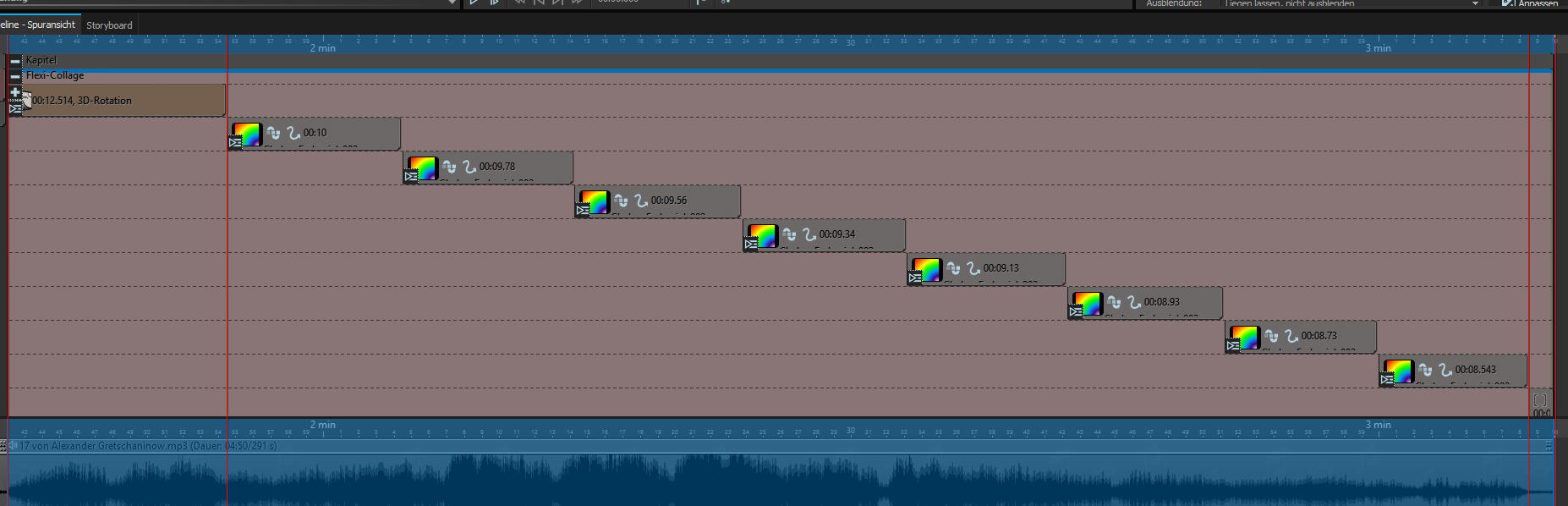 Nur damit ich es richtig verstehe: Du blendest Bild 3.7 per Transparenz aus? So verstehe ich, was Du schreibst und das irritiert mich ein wenig.Fakt ist aber, dass (in Beispielkapitel 2) die in der Flexicollage (Spur 3) befindlichen Bilder (Spur 3.1, 3.2, 3.3, 3.4, 3.5 und 3.6) nach Ablauf der Transparenzausblendung bei Bild 7 (Spur 3.7) auch kurzfristig wieder zu sehen sind.