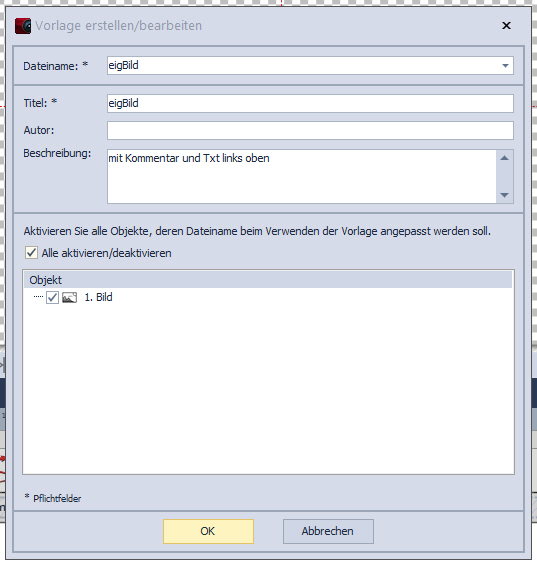 Der Haken darf nicht entfernt werden, wenn das Bild bei Benutzung der Vorlage durch ein anderes ersetzt werden soll, d.h. wenn sich der Datei-öffnen-Dialog zur Auswahl eines Bildes öffnen soll.Xaver hat geschrieben:Den ersten Teil habe ich schon entdeckt. Allerdings wird bei Bildobjekt immer das Bild der Vorlage mit gespeichert. Auch wenn ich den Haken entferne.