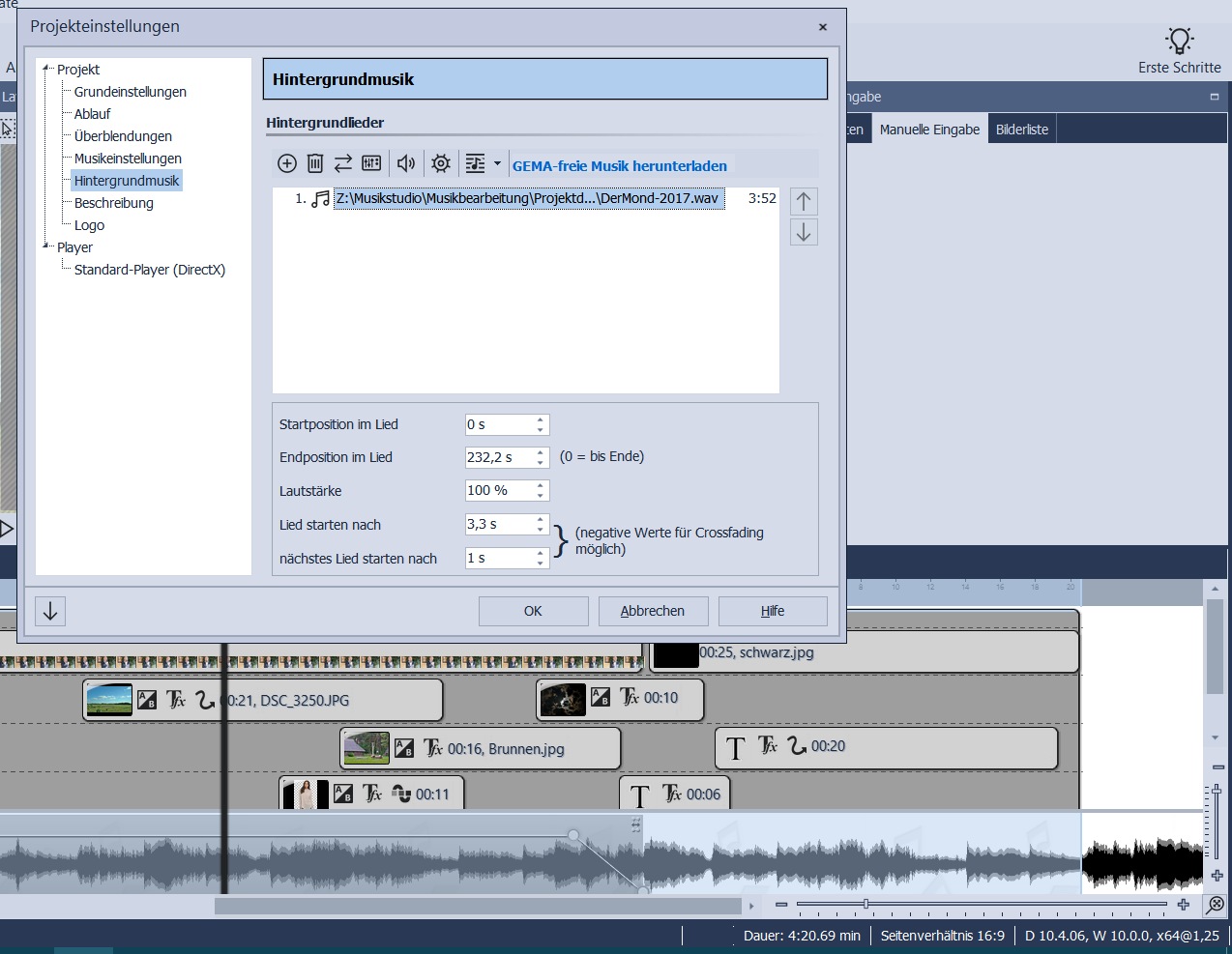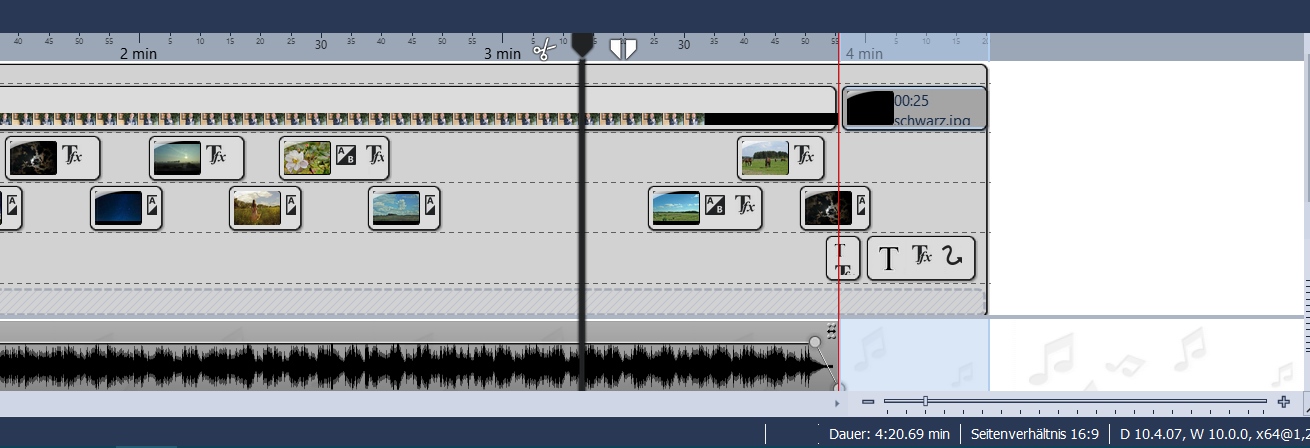 schon bei den letzten beiden Projekten ist aufgefallen, dass die Anzeige der Audiospur (Hintergrundmusik) nicht immer den tatsächlichen Gegebenheiten entspricht. Momentan bearbeite ich ein Musikvideo, in dem die Hintergrundmusik aus einer einzigen Audiodatei besteht. Zudem ist die Option "Titelliste automatisch wiederholen" deaktiviert. Trotzdem ist die Anzeige am Ende der Audiodatei so, als ob die Musikstück noch weiter gehen würde (s. beigefügter Screenshot).