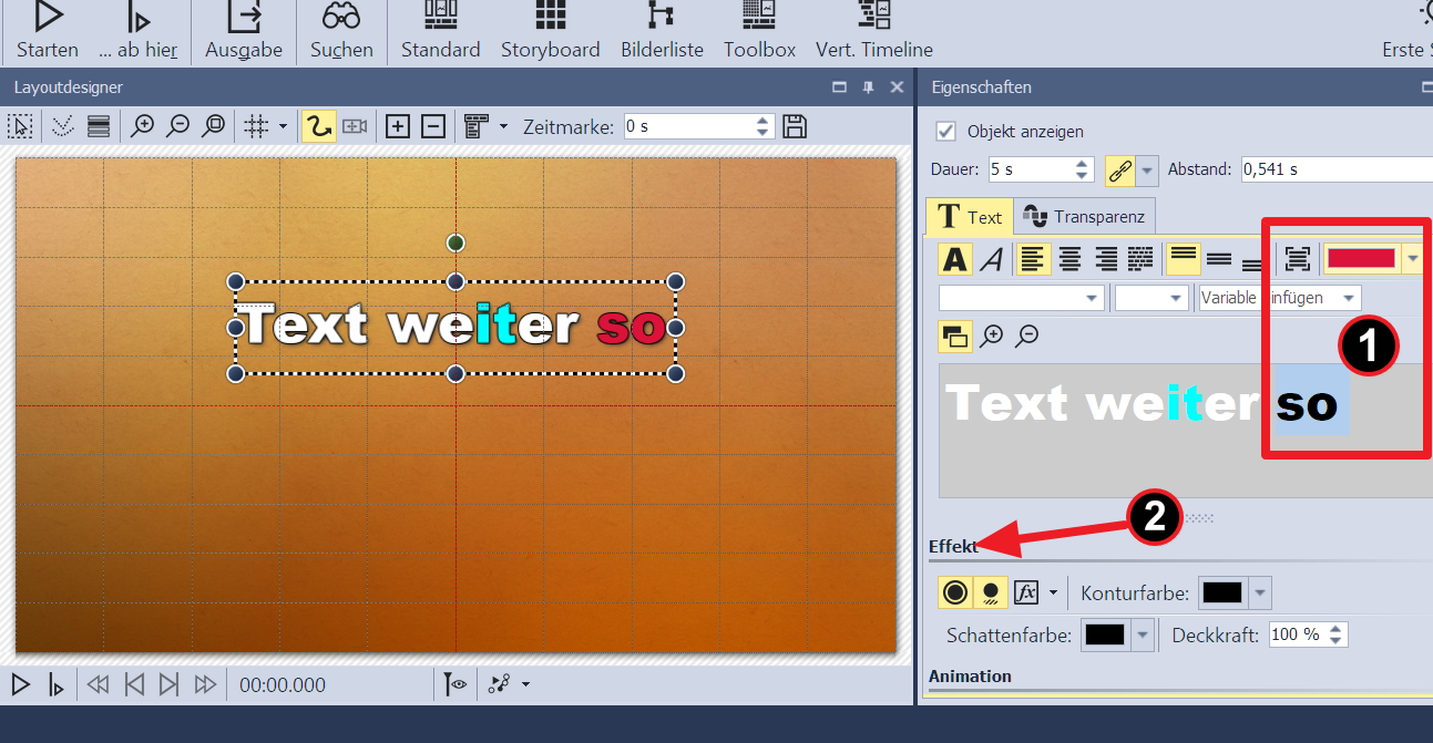 ...aber ich würde gern auch Schatten und Kontur auf einzelne Buchstaben/Wörter anwenden.