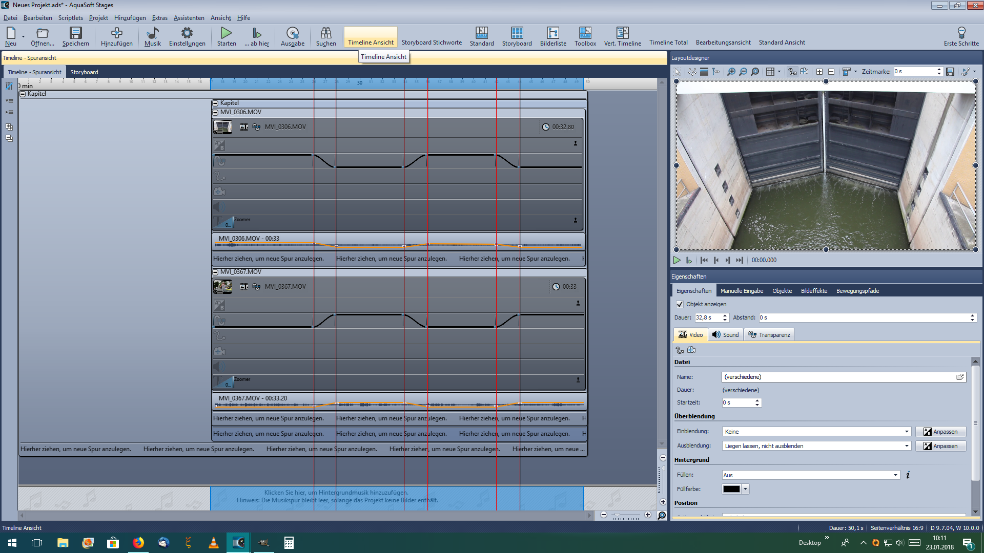 Da wollte ich auch gleich das ganze noch mit Ein- +Ausblenden probieren: da bin ich aber leider gescheitert, da immer nur eine (zwar verschiebbare) Einblende- und eine Ausblendelinie vorhanden ist. Gibt es hier einen Trick, um mehrere Ein- und Ausblendemarker zu setzen ?