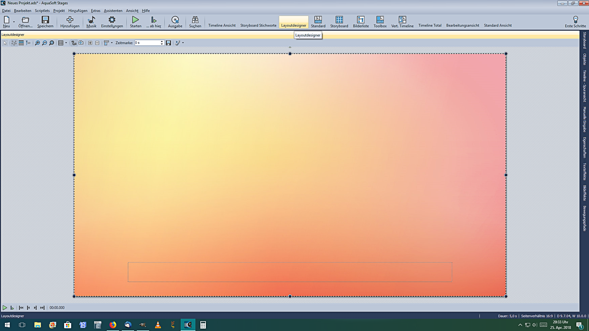 ich möchte die Größenverhältnisse (die Höhen) zwischen Menüzeile/Befehlszeile, Layoutdesigner und Timeline dauerhaft fest einstellen. Ich suche also das ideale Verhältnis.