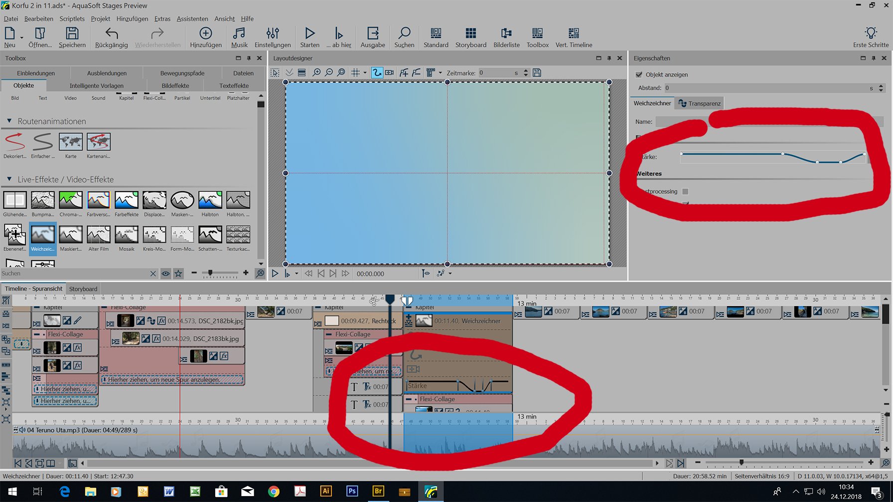2. P.S. Manchmal, wenn eine Kurve angelegt wurde, ruckeln dann auch die Weichzeichnungsübergänge. Man muss dann den Effekt noch einmal neu aus der Toolbox ziehen und anlegen und dann klappt es (vielleicht). Alles ist noch nicht so richtig.