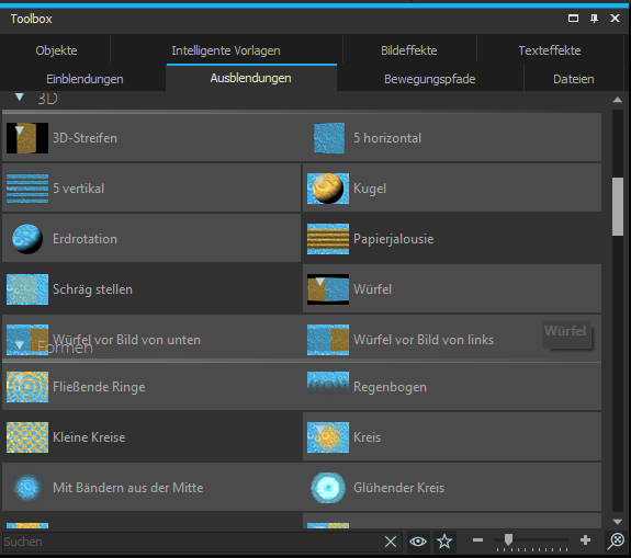 Verkleinere ich die Icons soweit, dass der gesamte Text lesbar ist, so kommt es sogar zu Überlagerungen, Kapitel Formen überlagert Ein-/Ausblendung Würfel vor Bild von unten. Das müsste also alles noch ei wneig auf "schick" getrimmt werden.