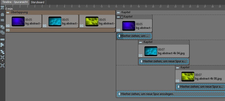 Man kann aus dem Screenshot nicht erkennen, in welchem Container sich die Bilder befinden. Falls es sich um den Objekt-Effekt Überlappung handeln sollte, so ist es klar, dass (außer dem ersten Bild) alle anderen in dem Effekt um die eingestellte Überlappung früher angezeigt werden. Überlappung heißt ja, dass die Bilder angezeigt werden, als ob sie in verschiedenen Spuren überlappend um den eingestellten Wert postioniert wären. Das folgende Beispiel zeigt das deutlich: Der 1. Container ist der Objekt-Effekt Überlappung, der zweite Container ist der Objekt-Effekt nach "Bearbeiten --> Objekt auspacken":