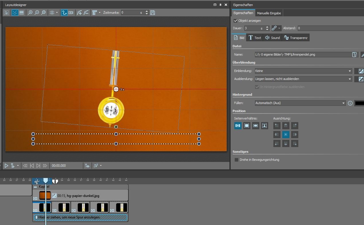 Ich habe ein Pendel im Sekundentakt von links, nach rechts, wieder nach links und schließlich wieder nach rechts schwingen lassen. Diesen Clip auf 3 Sekunden kürzen. Den Clip kopieren und gleich wieder eingefügen. Allerdings muss hier der Bewegungspfad umgekehrt werden. Das Ganze wurde hier noch 2 ... 3x wiederholt und das Ergebnis ist durchaus brauchbar.