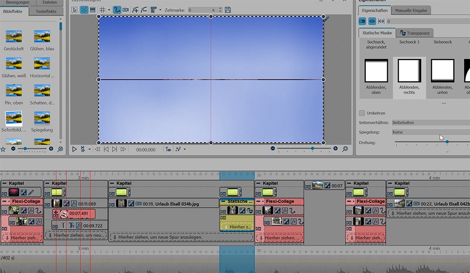 Wenn ich die statische Maske verwende mit der Maske Abblenden rechts, die u.a. ja zur Auswahl im Eigenschaftsfenster angeboten wird, dann erscheint nur ein Streifen (s. Bild). Ist das so gewollt bzw. habe ich diesen Effekt nicht verstanden oder hat sich da ein kleiner Fehler eingeschlichen.