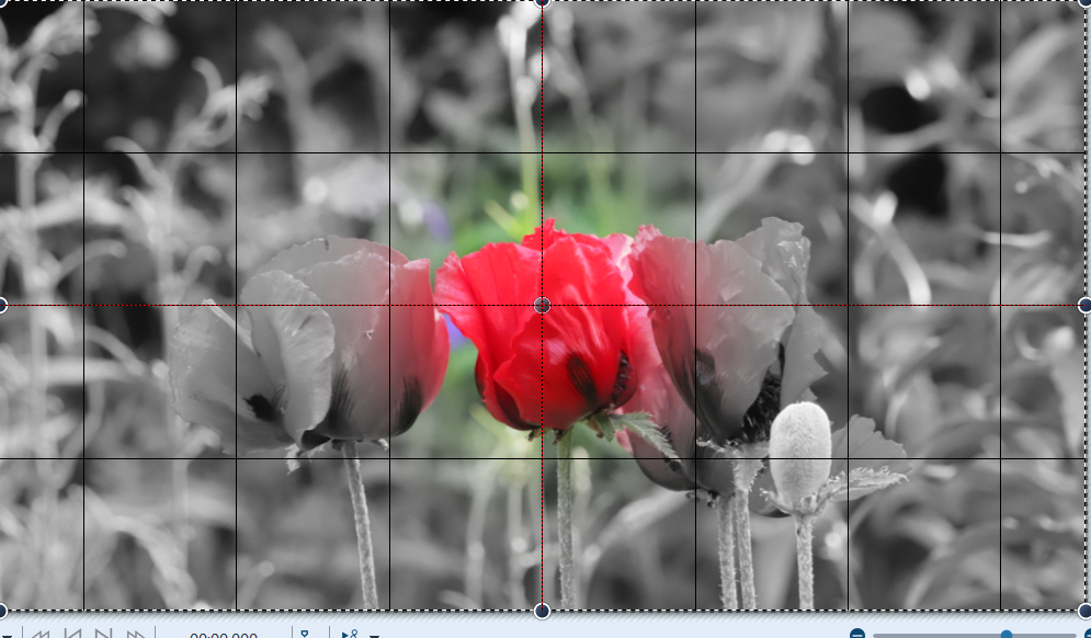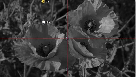 Ich habe ein Bild mit einer roten Mohnblume. Ich möchte gerne das Bild von Schwarz-Weiß in Farbe wechseln, in dem Moment , wo ein Regentropfen draufrollt.