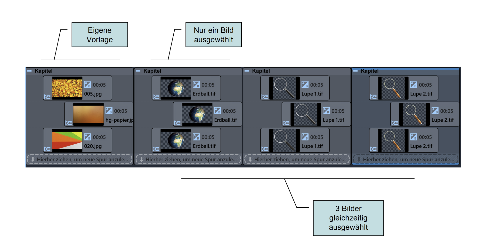Wenn ich diese Vorlage wiederverwende, werde ich aufgefordert, ein Bild auszuwählen. Ein zweite Aufforderung erfolgt nicht. Dann wird sofort die Vorlage in der Timeline erstellt und alle 3 Bilder haben den gleichen Inhalt.