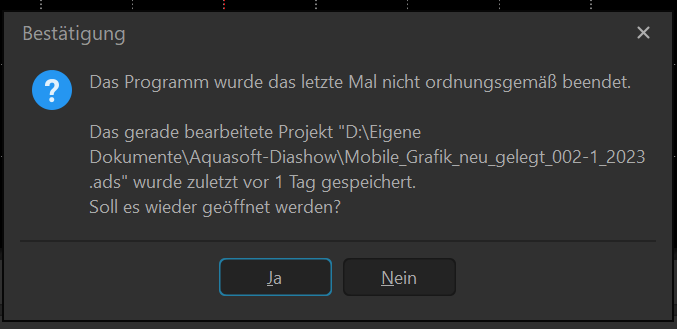 Der von Ihnen gepostete Screenshot ist allerdings eine Folge des "gewaltsamen" Schließens der Prozesse im Taskmanager. Diese Nachricht kann auch unabhängig von einem Update-Prozess erscheinen, wenn das Programm auf diese Weise aus dem Speicher entfernt wird, während noch ein Projekt geöffnet ist.