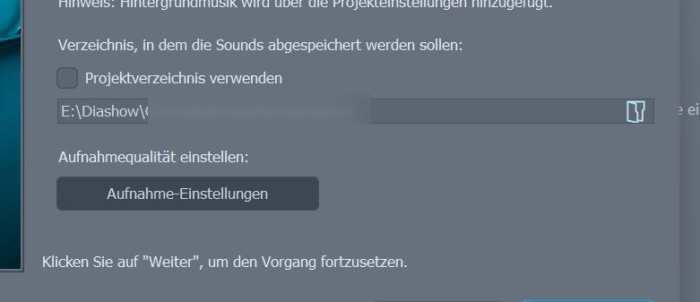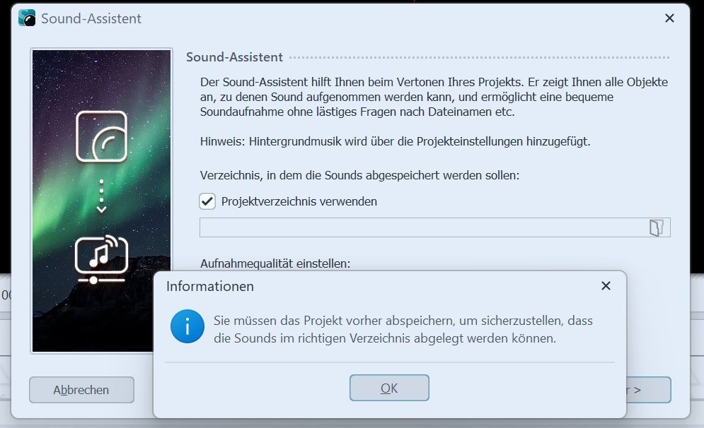 Wenn diese jedoch aktiv und das Projekt gespeichert ist, geht es gleich zum Aufnahmedialog.