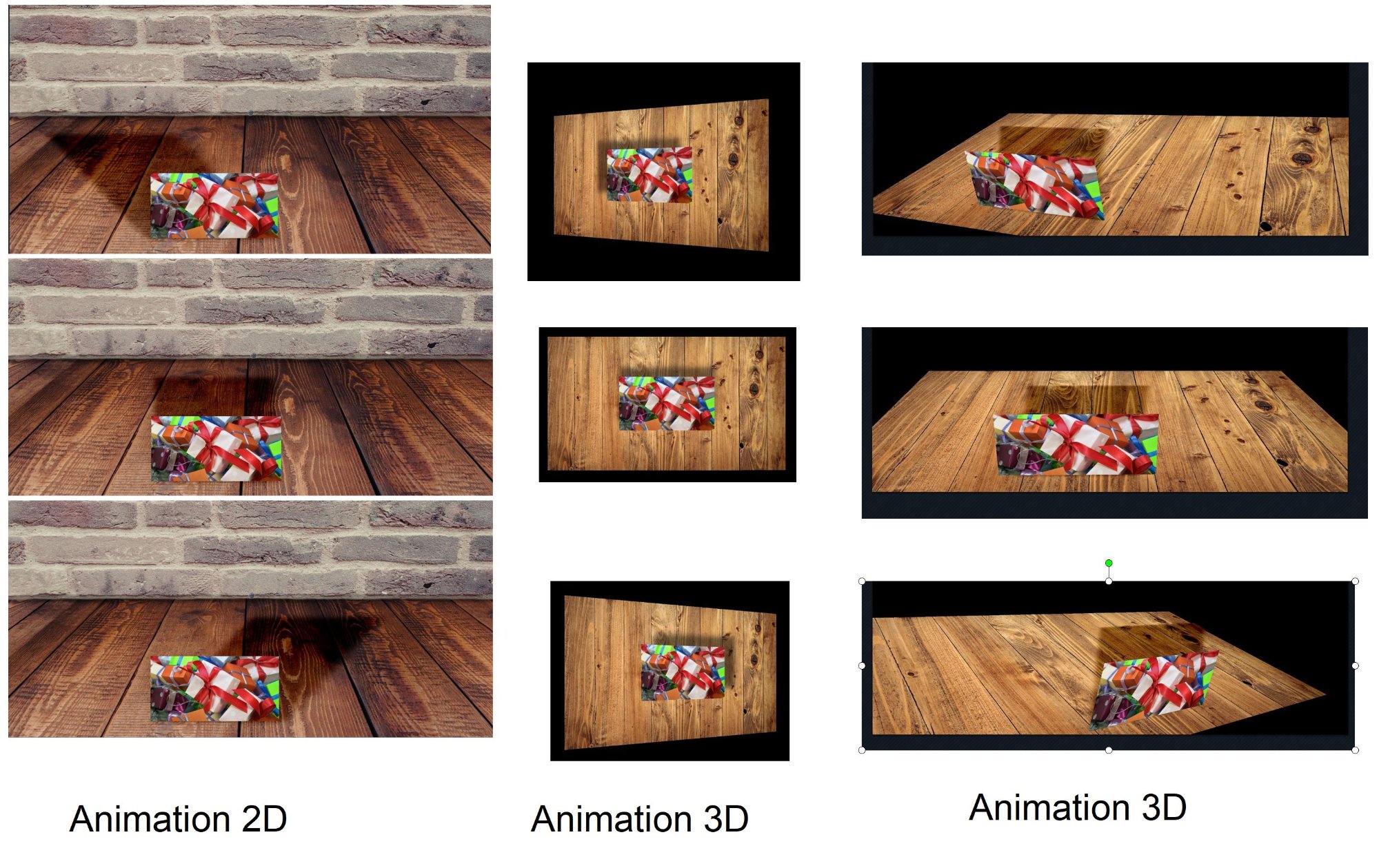 In der 2D-Variante bewegt sich scheinbar nur die Lichtquelle, um den Schatten wandern zu lassen. In den 3D-Varianten bewegt sich der Betrachter mit der Lichtquellen, sodaß sich der Schatten von links nach rechts bewegt.