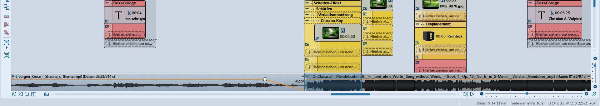 Hallo zusammen! Bei mir tritt bei Stages 2023 in der Musikspur gehäuft das Phänomen auf, dass aus einer glasklaren und übersichtlichen Wellendarstellung der Musik z.B. beim Zufügen eines weiteren Musikstücks die Musikspur des neuen Stücks plötzlich so gut wie komplett schwarz wird und man nichts mehr erkennen kann. Das Phänomen tritt sogar auf, wenn man ein Musikstück gegen exakt das gleiche austauscht. Damit klar ist, was ich meine, hänge ich zwei Screenshots an. Beim ersten ist ein Stück von Mendelssohn-Bartholdy normal dargestellt, beim zweiten sieht es nach einem Austausch mit sich selbst dann total verkorkst aus. AS hat mir auf Anfrage versichert, dass man diese "Erscheinung" nicht reproduzieren könne; und vielleicht ist es echt so, dass dieser faule Zauber nur meinem neuen Computer zu verdanken ist...