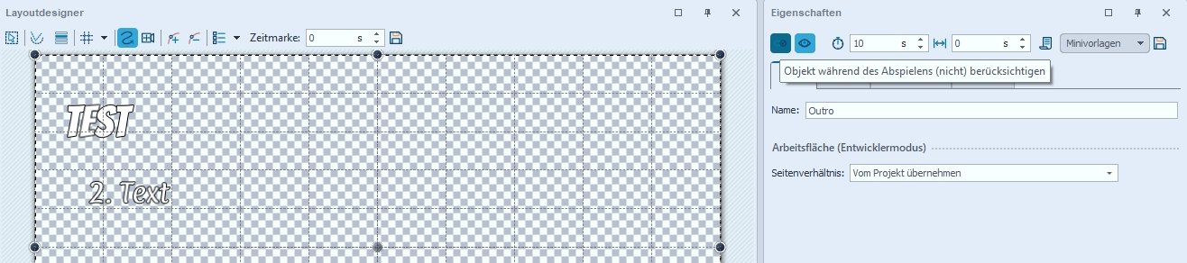du kannst das untere Textobjekt ausschalten. Im Eigenschaftsfenster links oben sind die Schalter, mit denen du das steuern kannst, ob ein Objekt angezeigt wird oder hörbar ist - siehe Foto. Klickst du das Outro an, kannst du beide Textobjekte ausblenden, klickst du nur die 2. Textzeile an, erscheint links oben nur ein Button, um dieses Objekt auszublenden. Sieht man am durchgestrichenen Button.