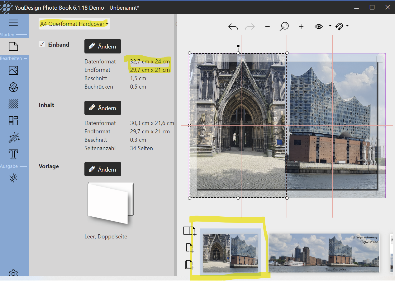 Aber der Einband bleibt auf A4 Hoch auch beim erstellen der Druckansicht.