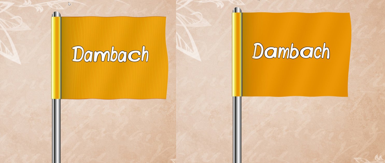 wie man im Bild sieht, werden die Farben bei mir leicht unterschiedlich zwischen Stages 2025 (links) und Stages 2024 (rechts) dargestellt. Außerdem sind leichte Längsstreifen in Stages 2025 zu sehen. Die hier dargestellte Fahne wurde mittels Desplacement-Effekt animiert. Es handelt sich im Übringen um das Gleiche Objekt in Stages 2025 und 2024.
