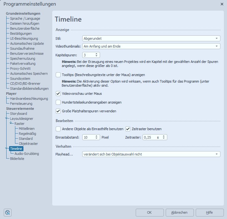kann sein, dass ich mit meiner 2025-Version veraltet bin, aber erst mal arbeite ich damit weiter, auch wenn zur Zeit das eingestellte Zeitraster in der Timeline ignoriert wird. Die Einstellung ist am angehängten Screenshot zu sehen, aber die Objekte rasten nicht ein und bleiben an beliebigen Sekundenbruchteilen genau dort stehen, wo die Maus sie loslässt. Glaube kaum, dass mich die Erinnerung trügt, wenn ich meine, das hätte seit "ewigen Zeiten" so funktioniert, dass mit "Mausverschiebung" die Objekte exakt dem Zeitraster entsprechend stehen geblieben sind.